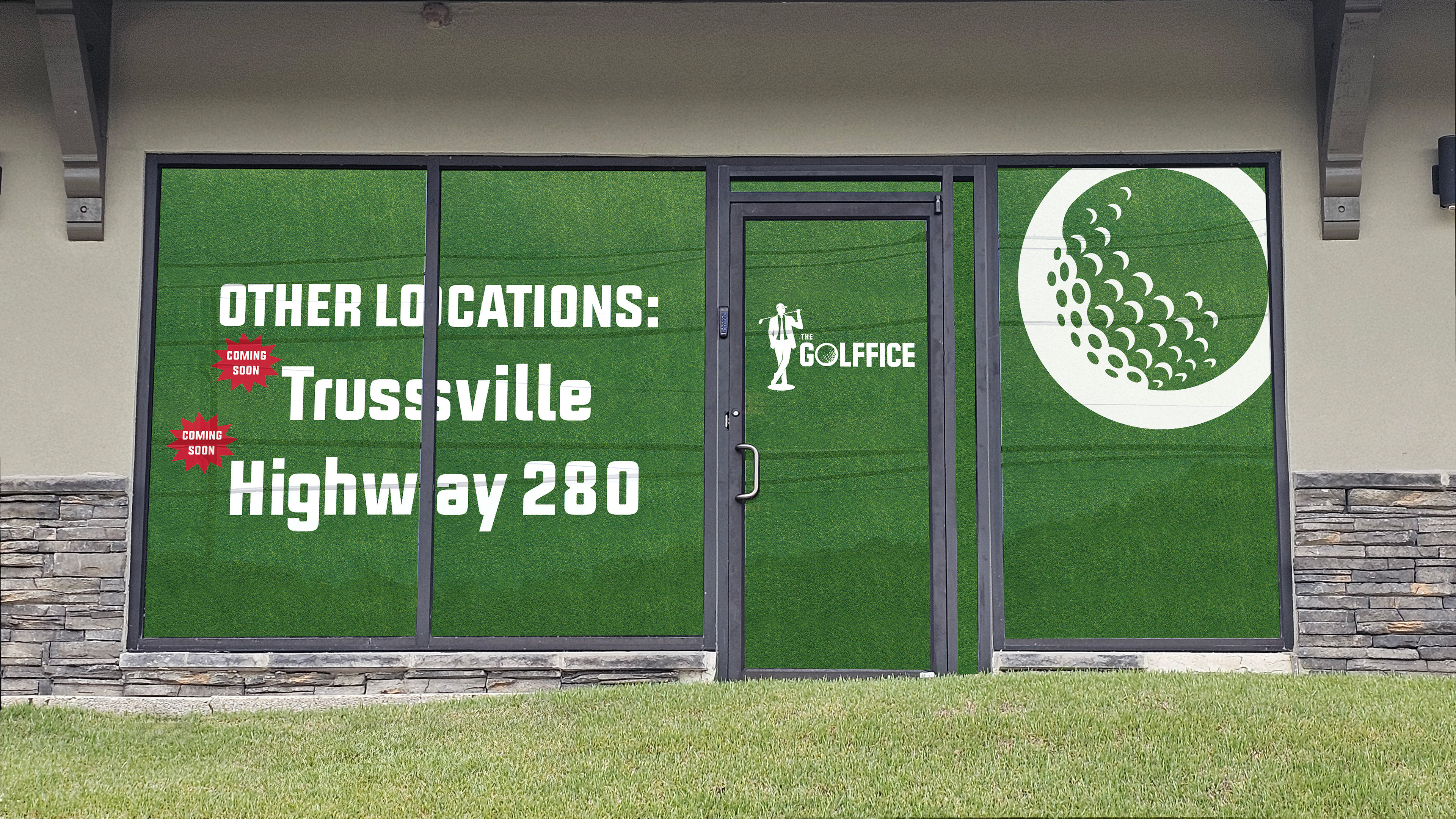 The Golffice is a 24/7 indoor golf business expanding into two new locations. While at CSE Graphics, I led the design of promotional materials and large-scale window graphics to support the rollout.